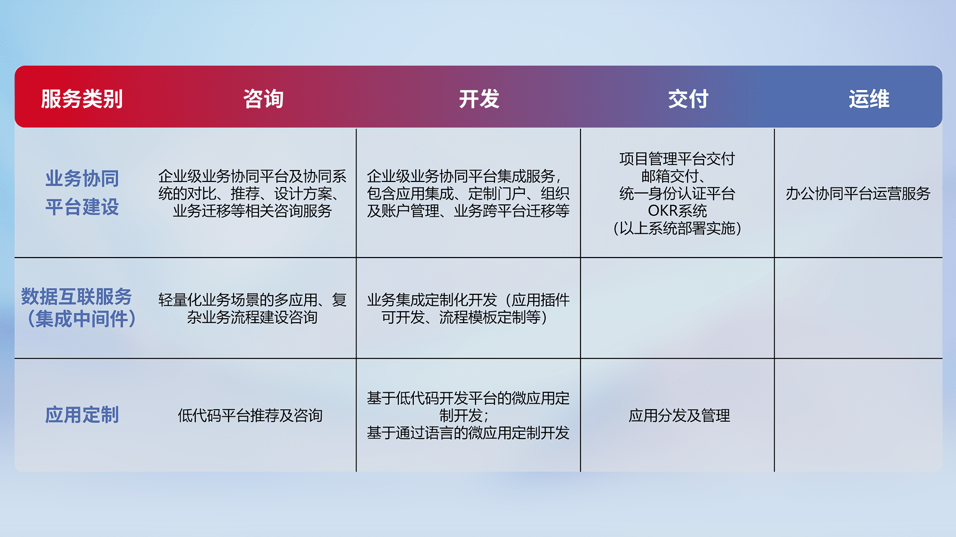 针对钉钉、、企微、、IDaas等平台级产品提供产品的规划、、方案、、、、交付、、定制化开发等服务,,实现如统一协同办公、、智能客户服务、、、混合会议管理、、、、智能数据查询、、、、等业务场景,,,实现数字化转型。。。。