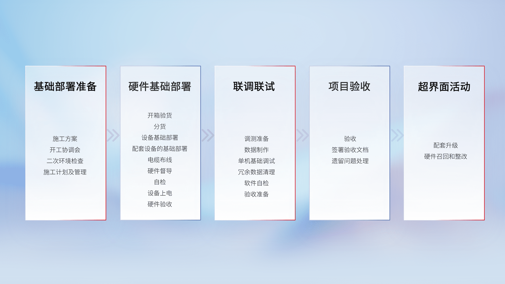 从基础部署准备、、、硬件基础部署、、、、联调联试、、、、项目验收、、越界面活动的全过程可追溯,,保证施工质量和进度。。。。
